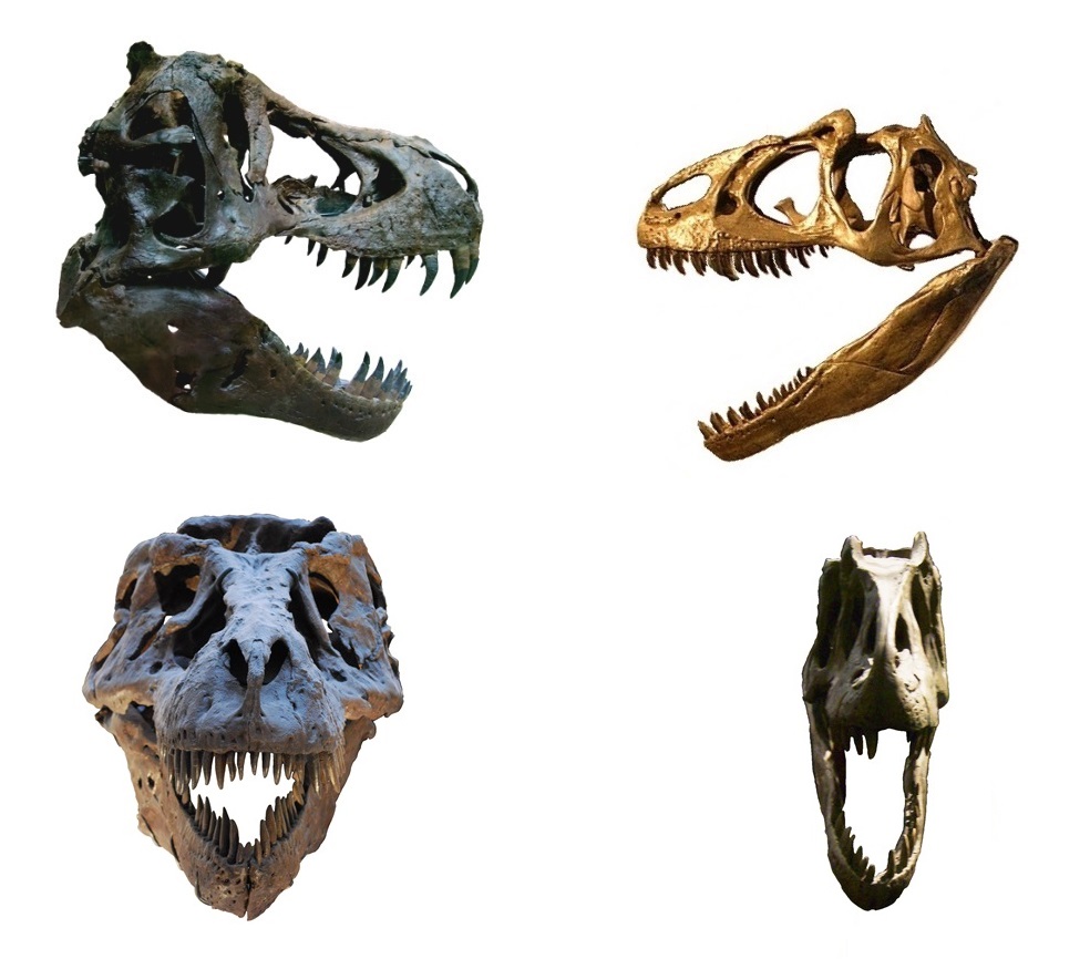 Comparison of skull sizes between a Tyrannosaurus rex (left ) and an Allosaurus (right). Whilst length between Tyrannosaur skulls and other large therapods is comparible, the width and strength is not.