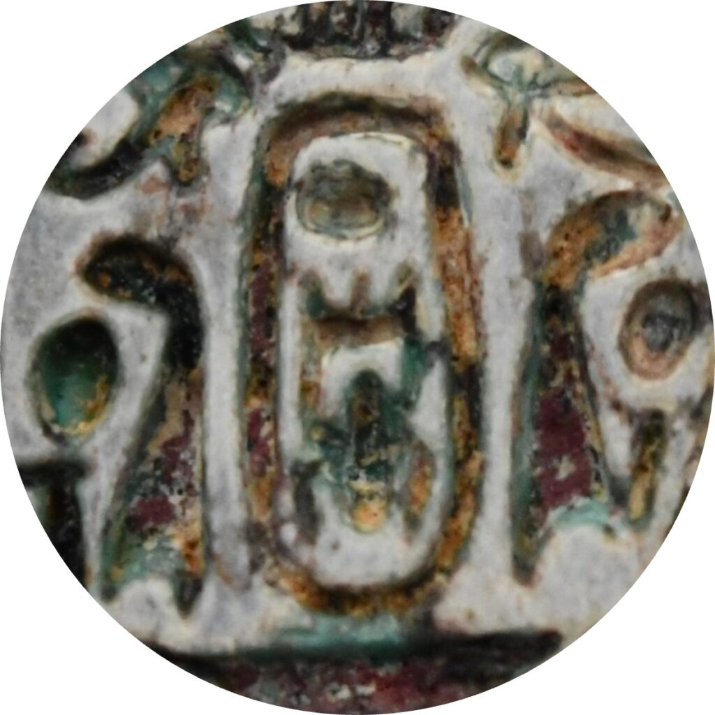The centre of the scarab is an oval royal cartouche forming the throne name of Pharaoh Thutmose III, ‘Menkheperre’.