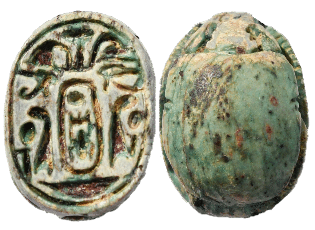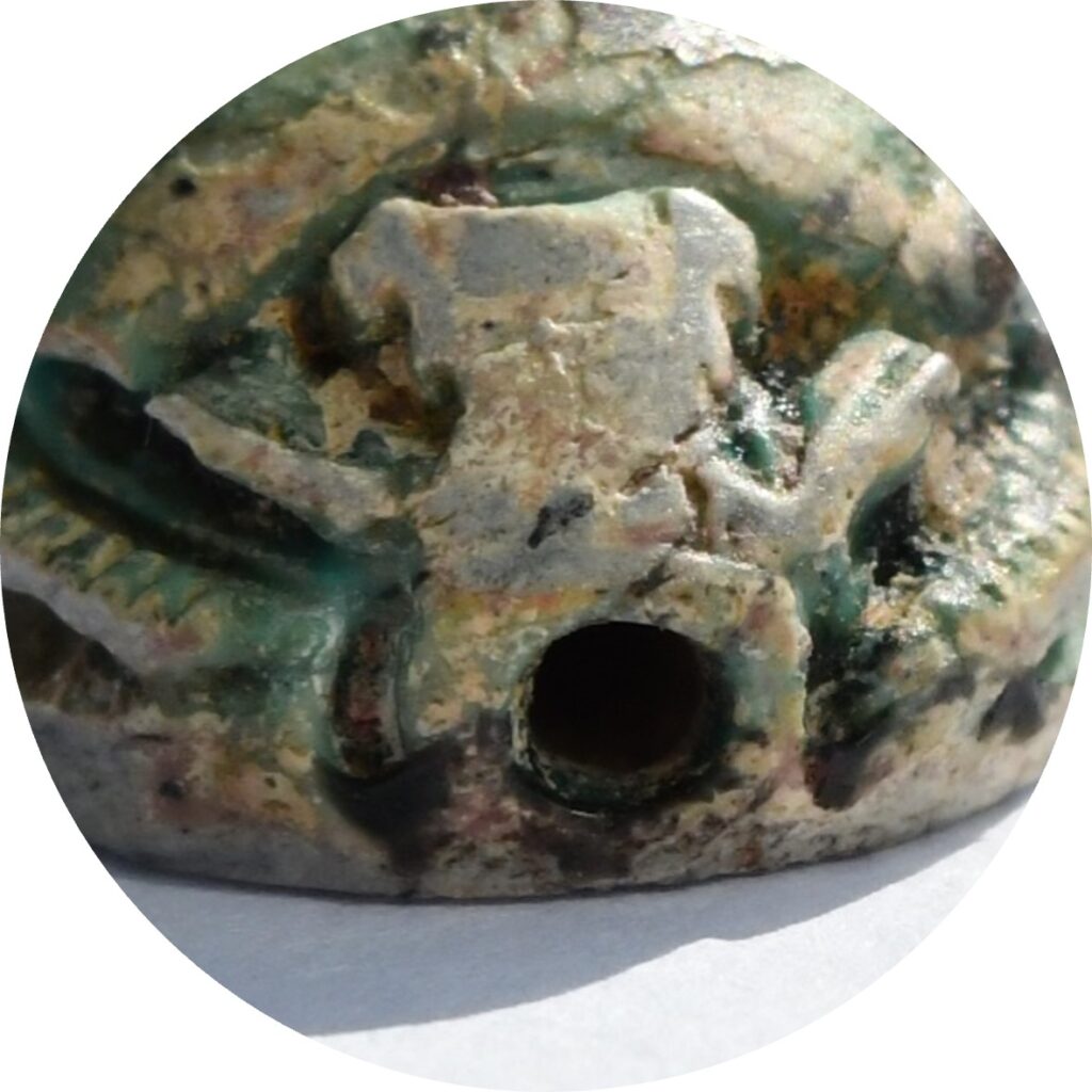 Details of the scarab beetle are engraved on the top side of the amulet, including the head and legs.
